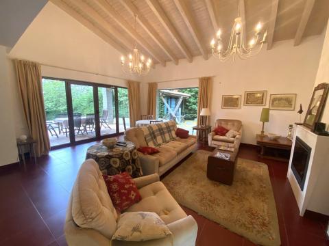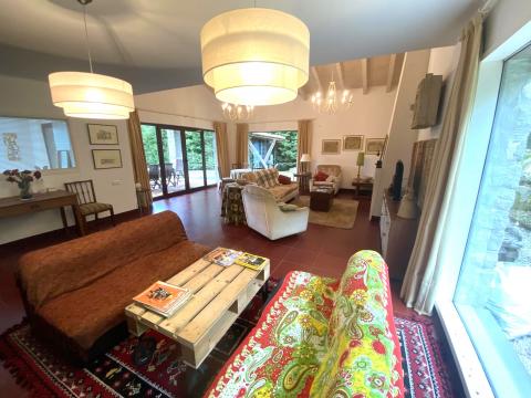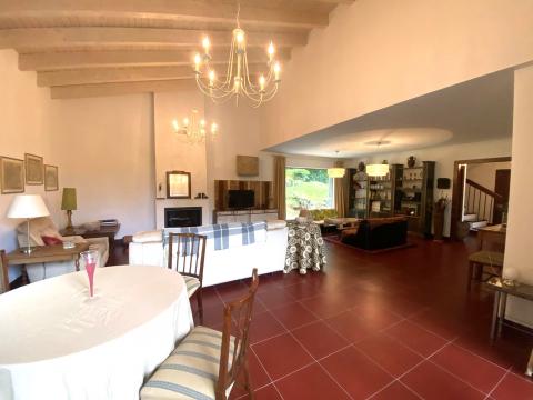 The lounge/dining room has a wood burning stove and various seating areas with sofas, high ceilings (up to 4m) and tiled floors throughout the ground floor. Also on the ground floor there is an entrance hall, a guest bedroom, a high specification bathroom and a wine storage area.