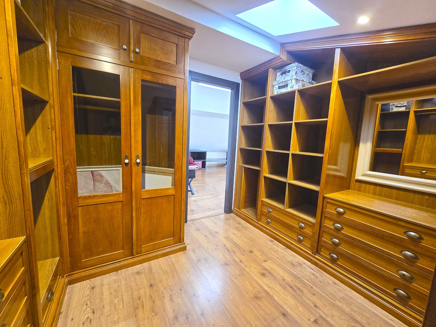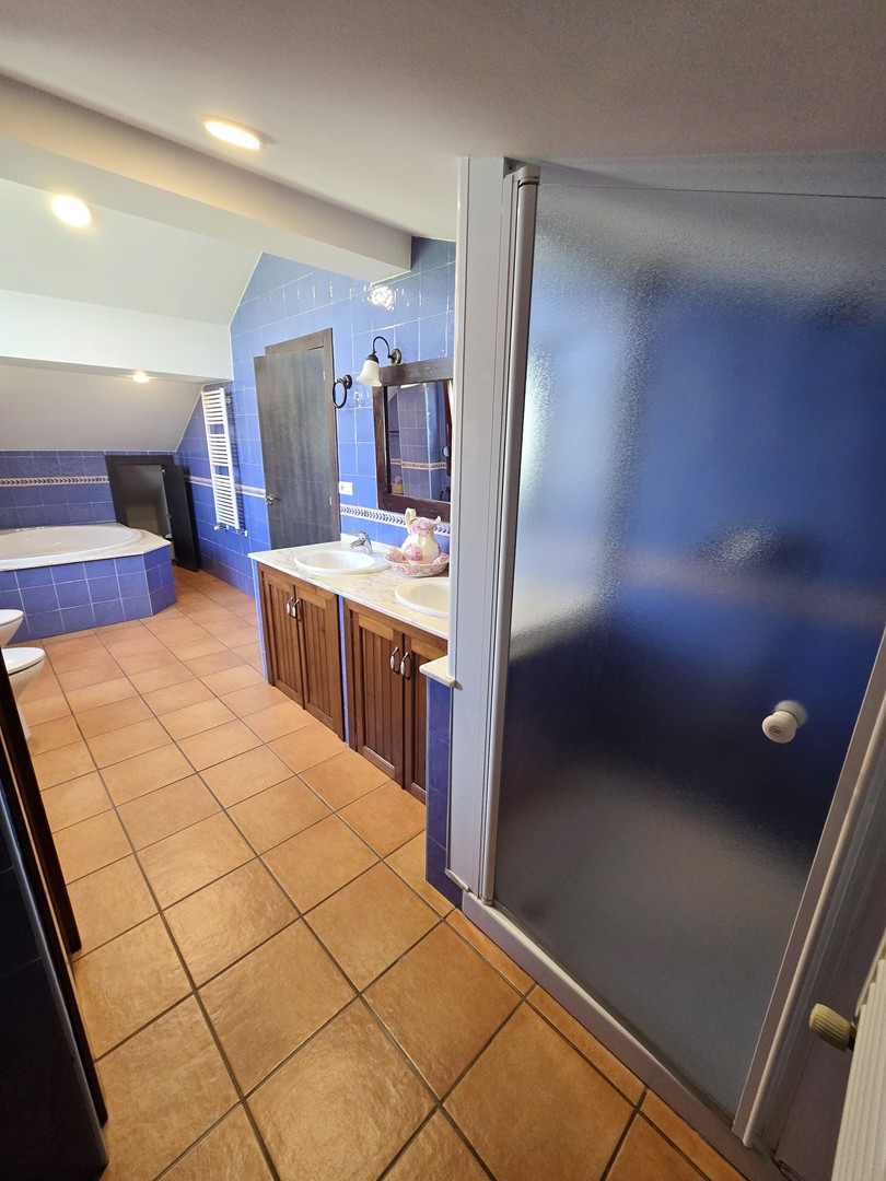 The upper floor is entirely dedicated to an impressive principal bedroom suite of approximately 50 m², offering a high degree of privacy. It includes a generous dressing area and a large bathroom fitted with a hydromassage bath, separate shower and double basin.