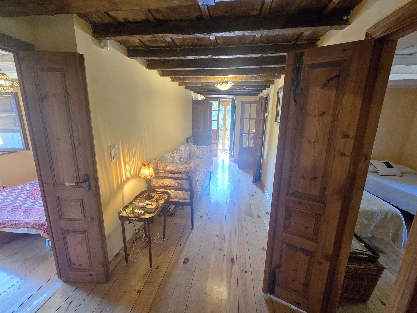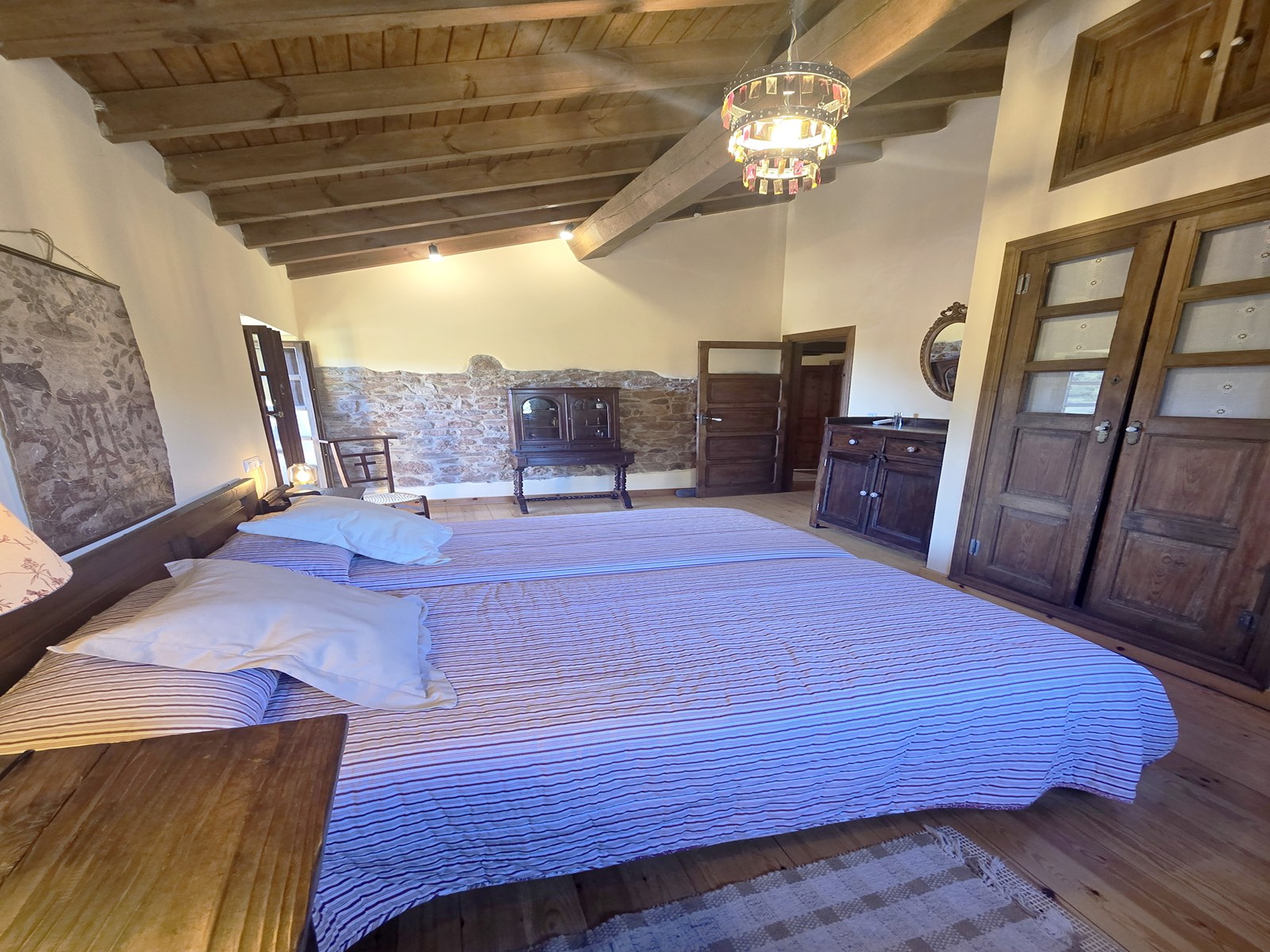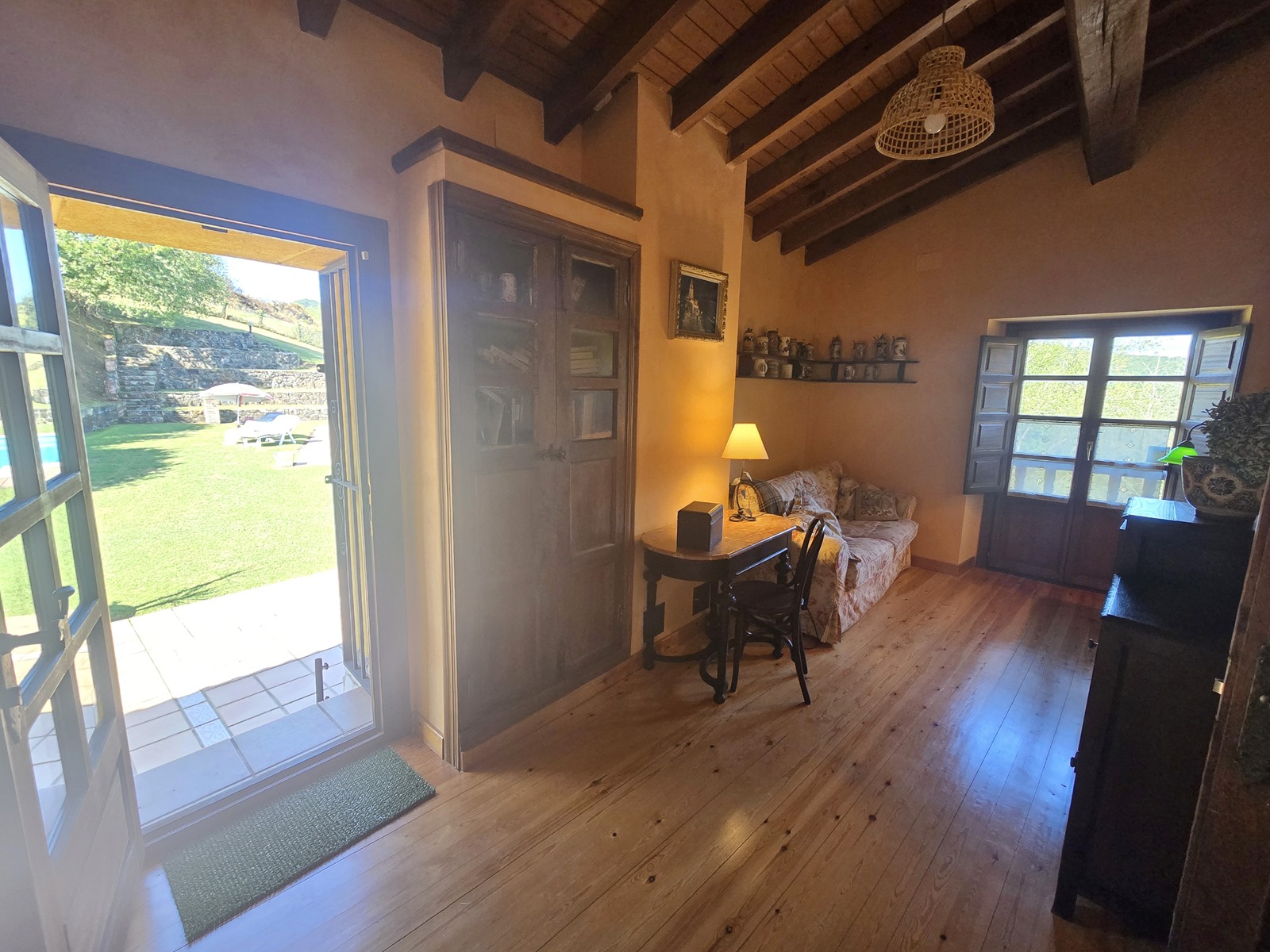 - First floor: bright sitting area with direct access to a 32 m² terrace overlooking the pool, four bedrooms, one bathroom, and a traditional wooden balcony.