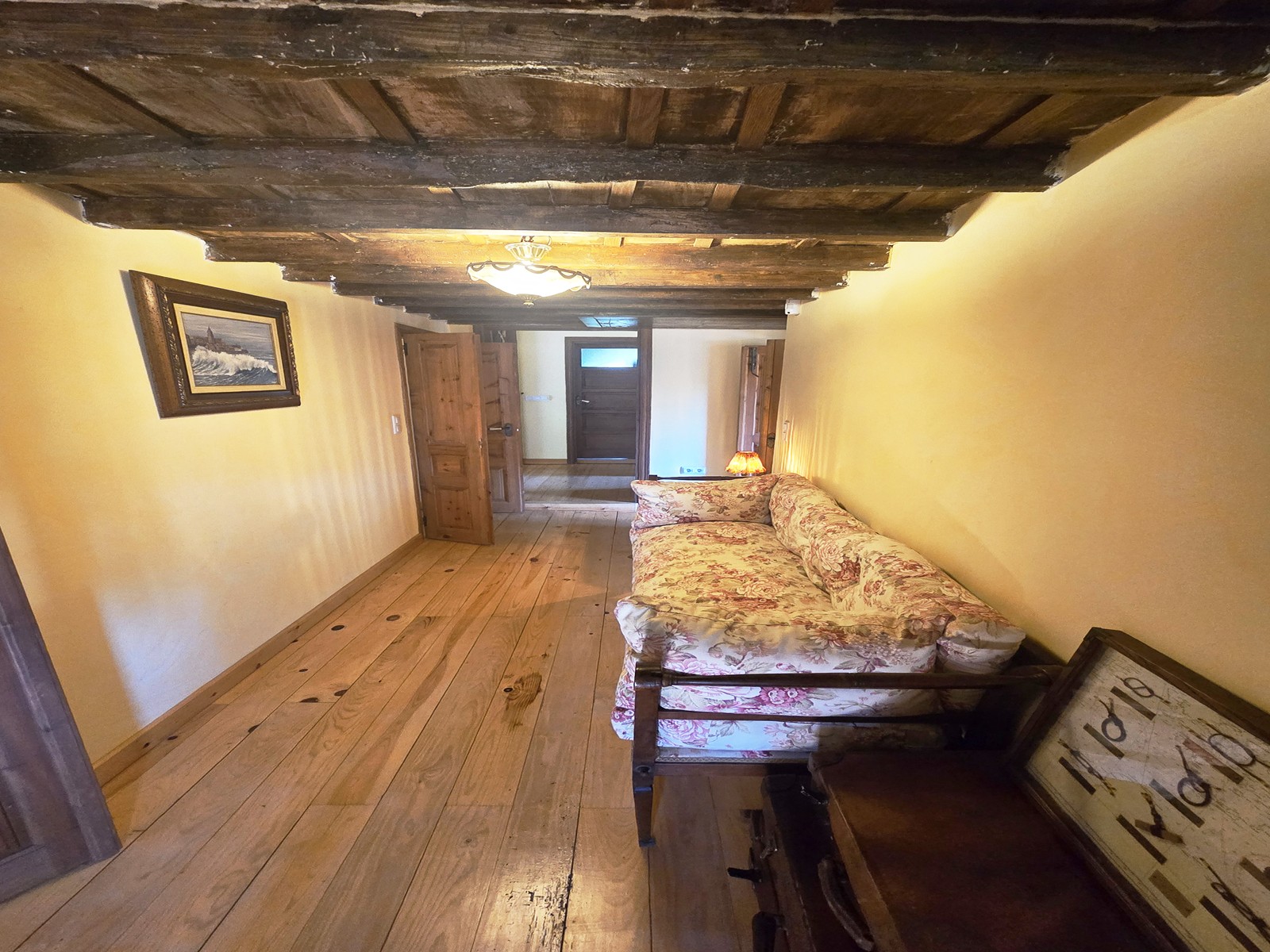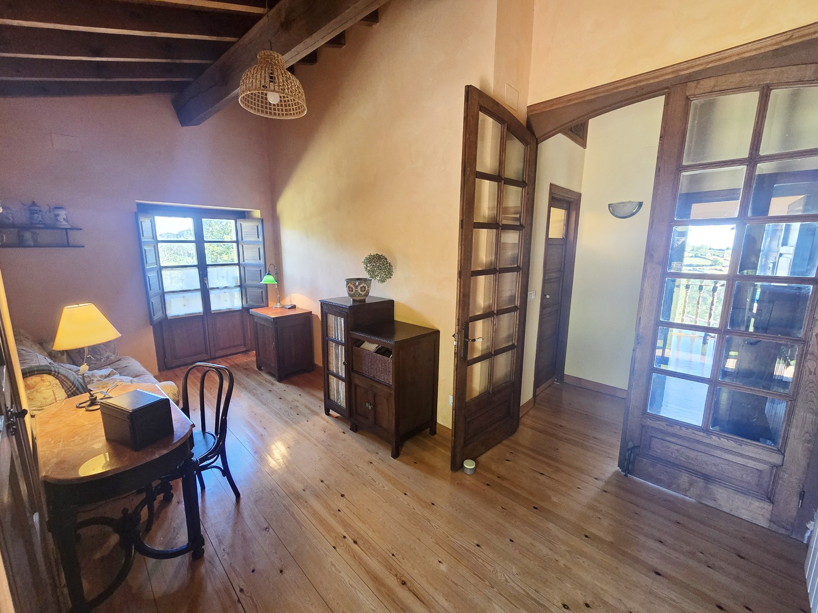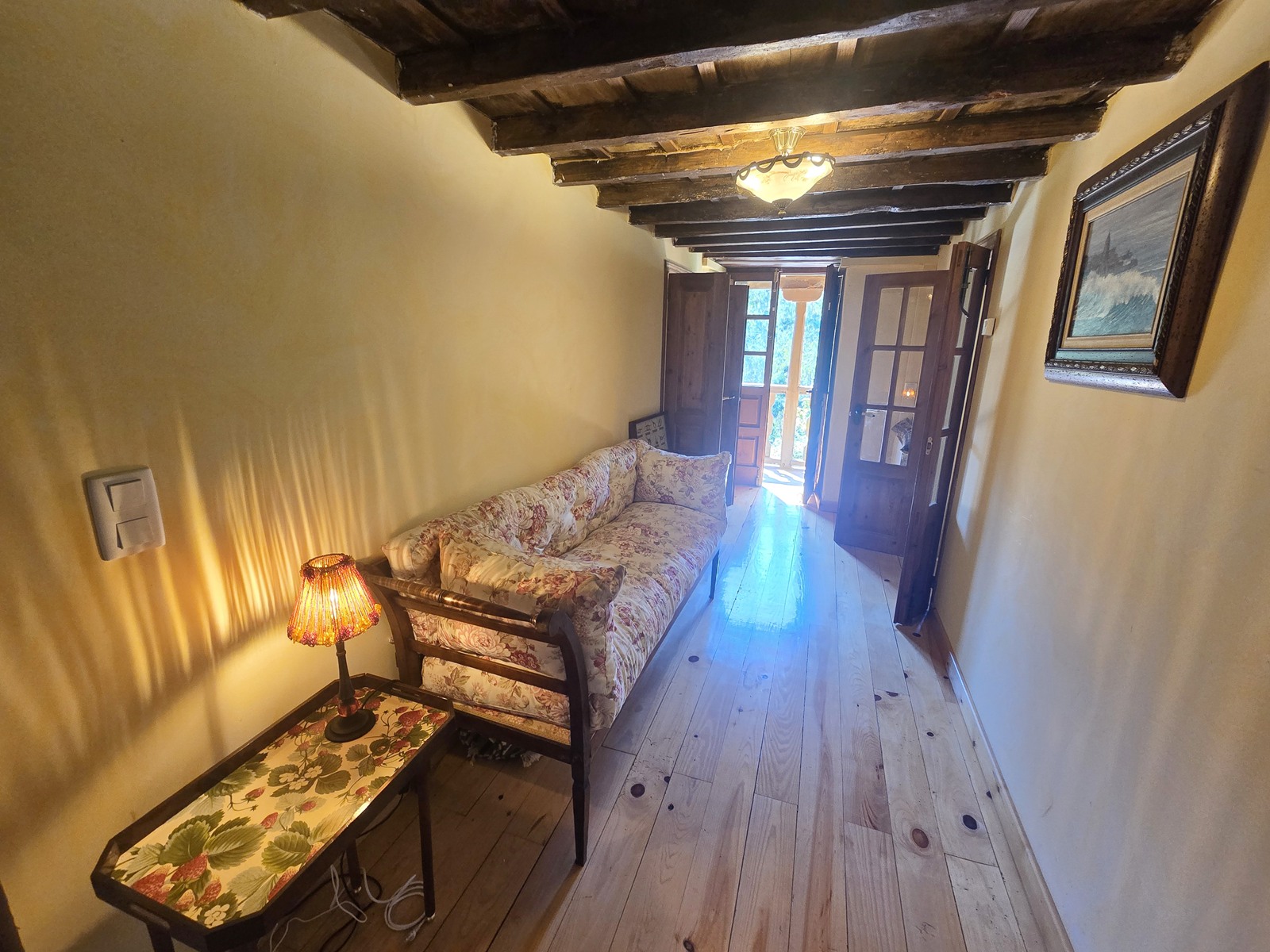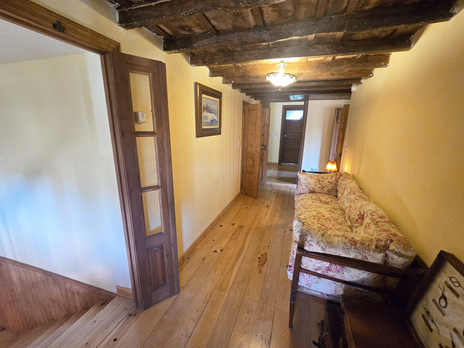 - First floor: bright sitting area with direct access to a 32 m² terrace overlooking the pool, four bedrooms, one bathroom, and a traditional wooden balcony.