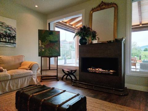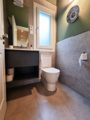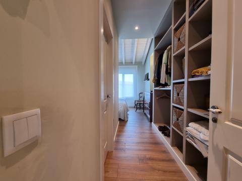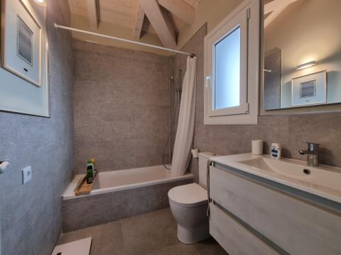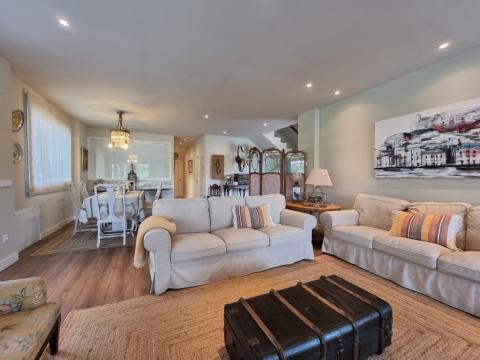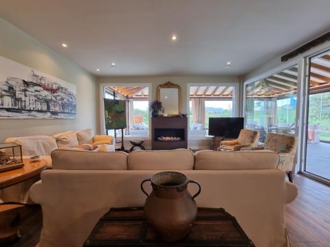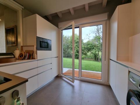 On the ground floor there is a large living room/dining room with a bioethanol fireplace, a fully equipped kitchen with access to the garden, a bedroom with dressing room and ensuite bathroom, a second bedroom and a main bathroom. The living room has access to a spectacular external covered seating and dining area. This area can be enclosed with glass curtains.